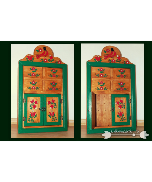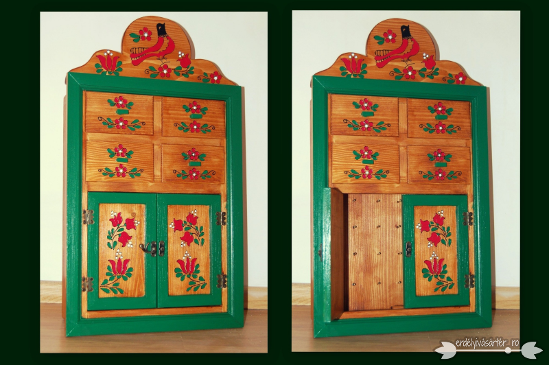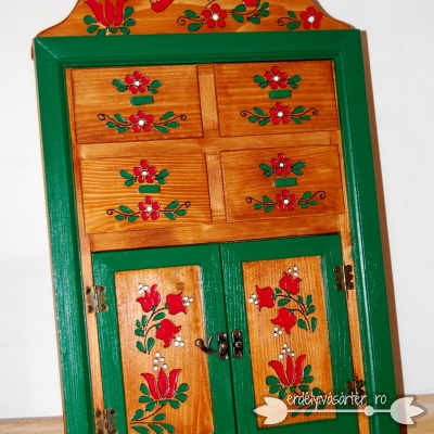 Az ajtók mögött akasztókkal láttuk el a helyet, hogy fülbevalókat lehessen szépen felakasztva tárolni! A fiókoknak is bizonyára megvan a maguk funkciója!