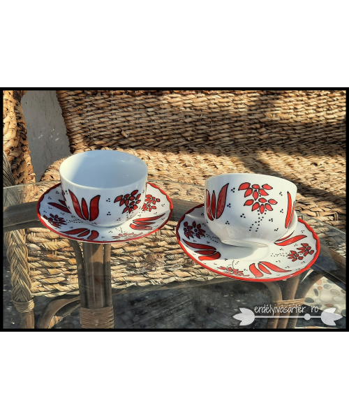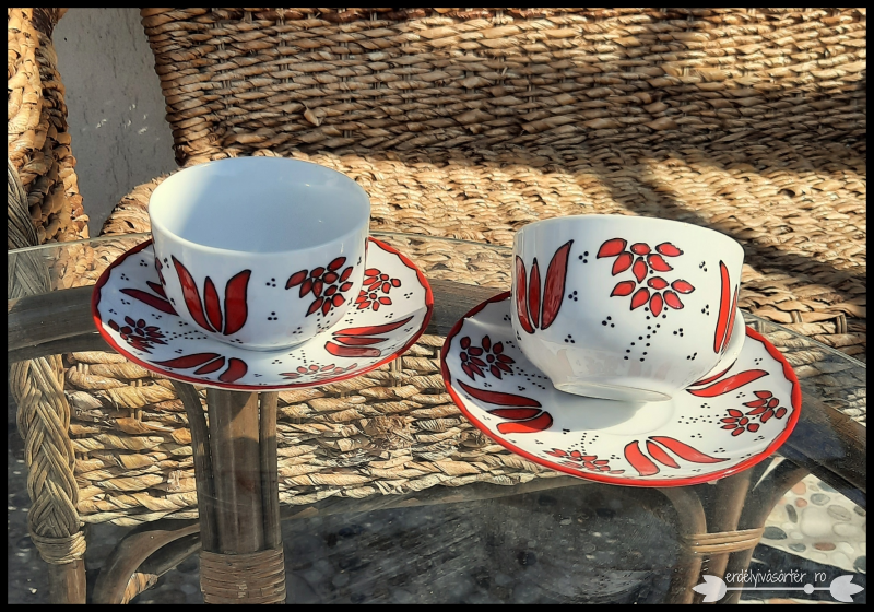 Piros népi motívumokkal díszített porcelán csésze és tányér.
