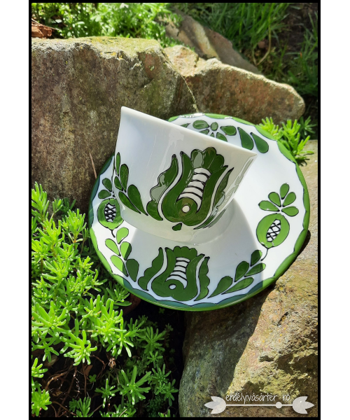 Népi motívumokkal díszített porcelán csésze és tányér.