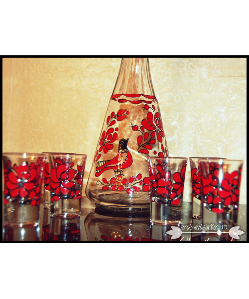 Madárkával és népi motívumokkal díszített pálinkás készlet, pálinkás üveggel.