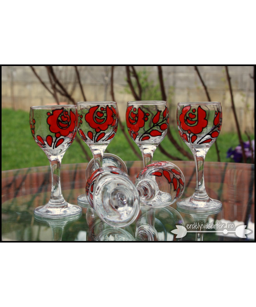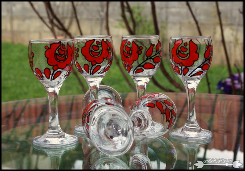 Népi motívumokkal díszített pálinkás talpas poharak.