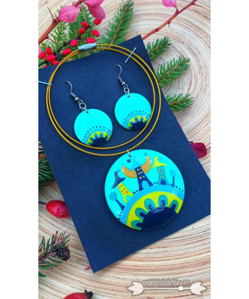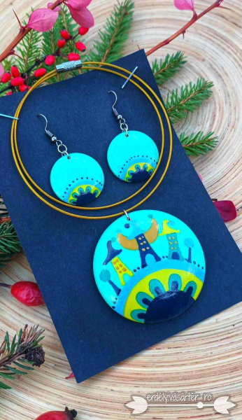 Az ékszerek fa alapra készülnek és vízálló festekekkel vannak megfestve. Fényét a lakkozás adja.