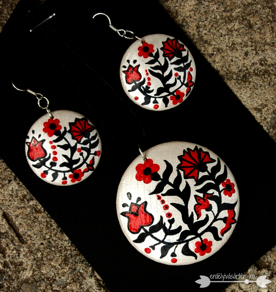 Az ékszerek fa alapra készülnek és vízálló festekekkel vannak megfestve. Fényét a lakkozás adja.