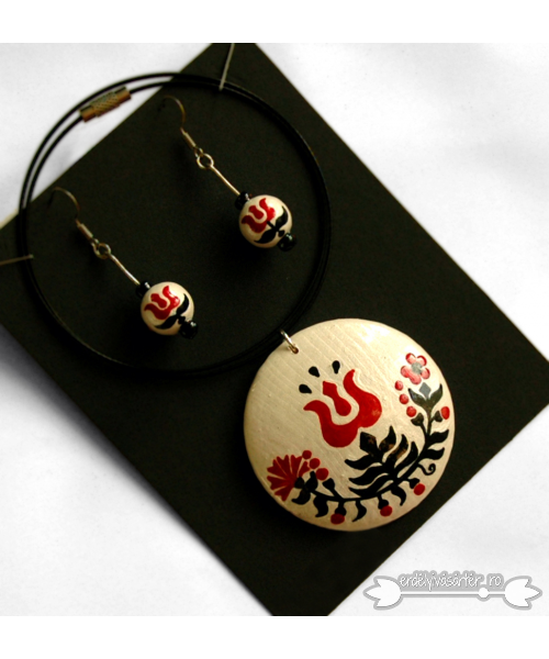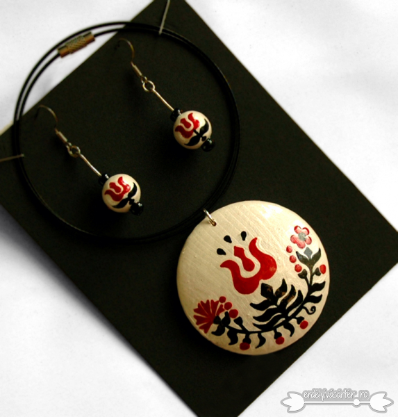 Az ékszerek fa alapra készülnek és vízálló festekekkel vannak megfestve. Fényét a lakkozás adja.