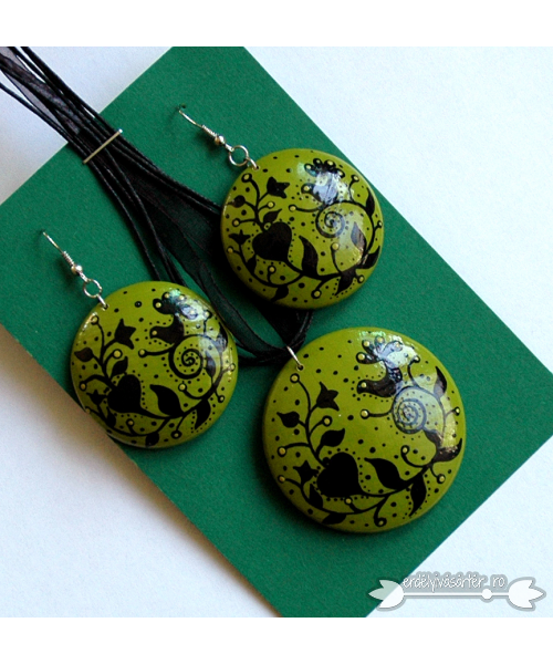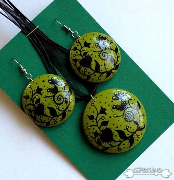 Az ékszerek fa alapra készülnek és vízálló festekekkel vannak megfestve. Fényét a lakkozás adja.