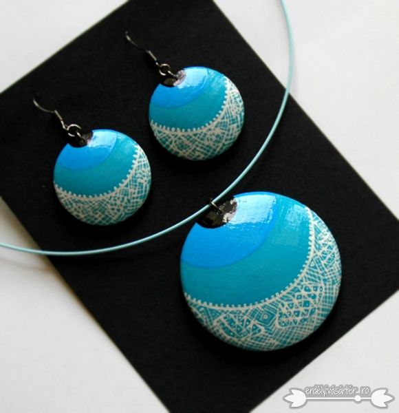 Az ékszerek fa alapra készülnek és vízálló festekekkel vannak megfestve. Fényét a lakkozás adja.