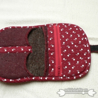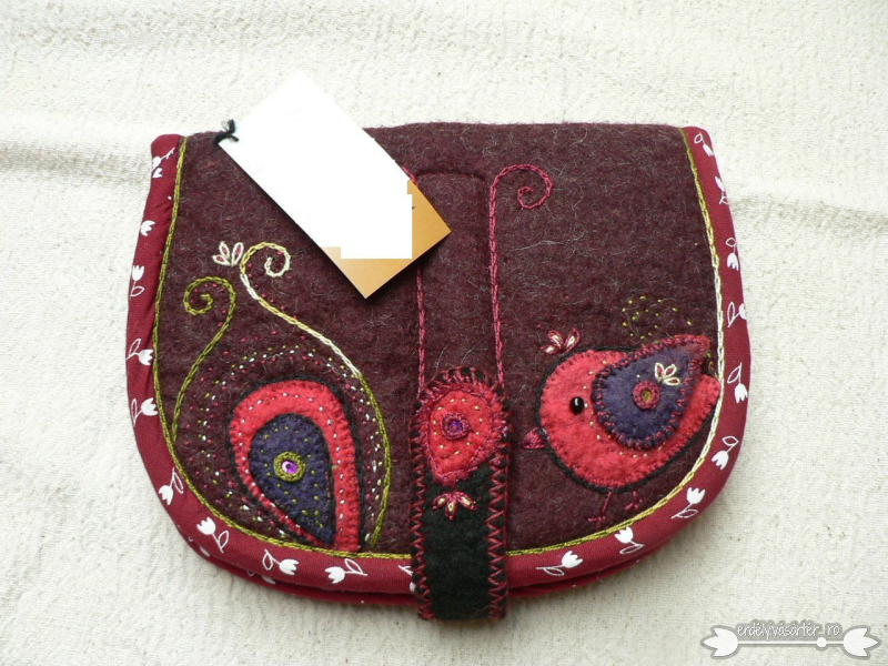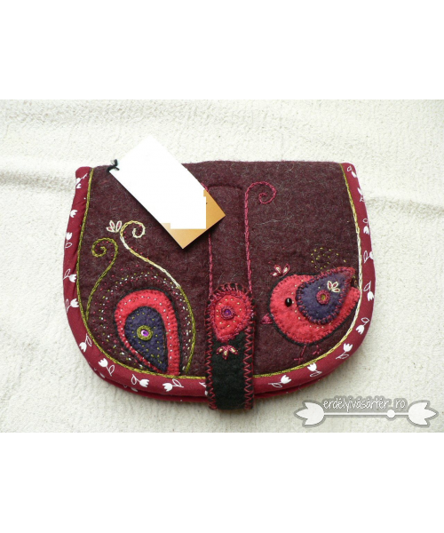 Nemezelt pénztárca pamutanyaggal szegve, kis zsebekkel. Nemezrátétes minta díszíti gyöngyökkel és varrással.