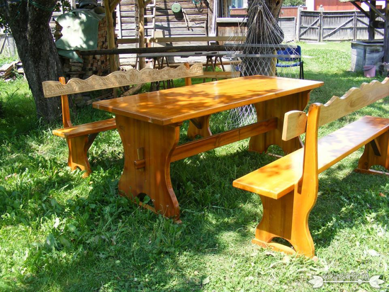 Tartalmazza az asztalt, és a két faragott háttámlájú padot. A padok 2 m hosszúak.